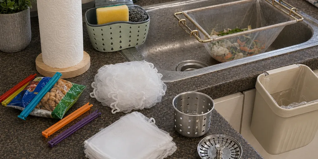 다시 산다면 1번 메쉬 거름망, 3번 걸이형 음식물통, 4번 밀봉 클립, 5번 스펀지 바구니 정도. 2번은 취향템이고, 6번은 싱크대 구조 타고, 7번은 사이즈 맞을 때만 추천임.